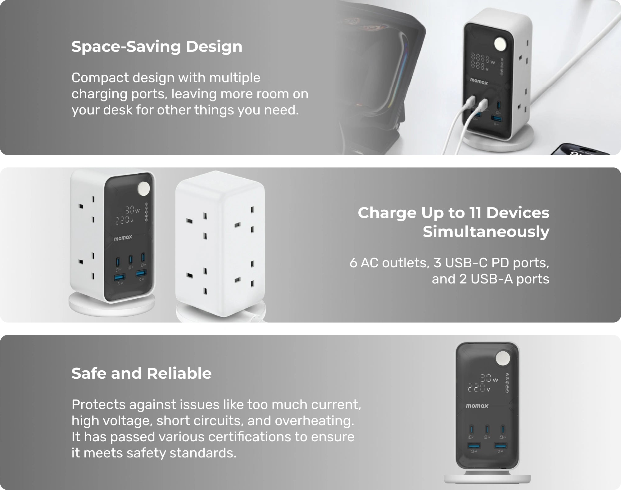 This isn’t just a charger; it’s a lifestyle upgrade. Simplify your workspace while enjoying powerful performance—all wrapped up in an elegant design that fits seamlessly into any workspace. Get your Momax 1-Charge Work Flow Power Tower now and experience seamless and smart charging!