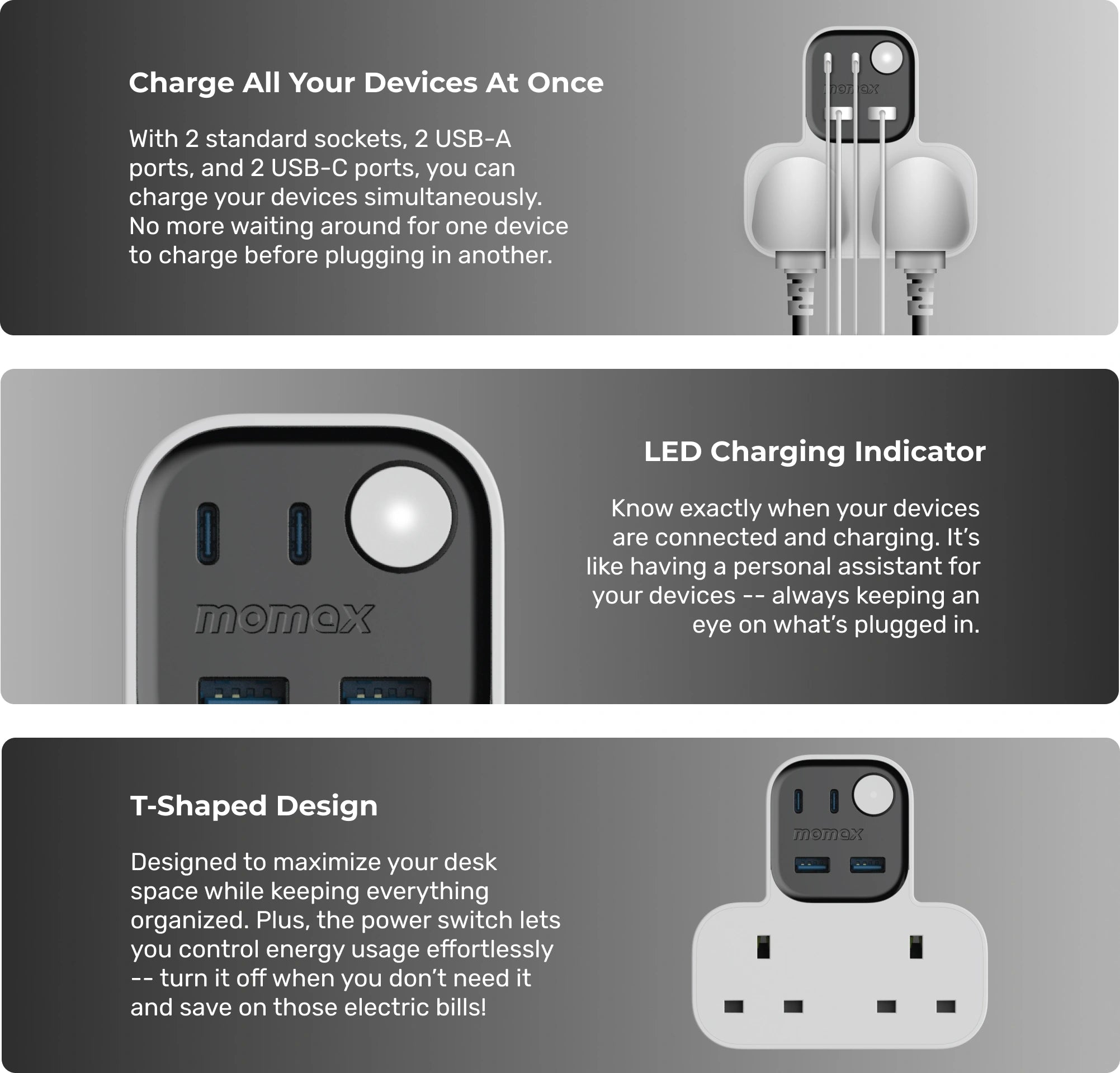 Select innovation; choose Momax 1-Charge Work Flow T-Shaped Extension Cord today. Experience the perfect combination of speed, elegance, and practicality that fuels your productivity.