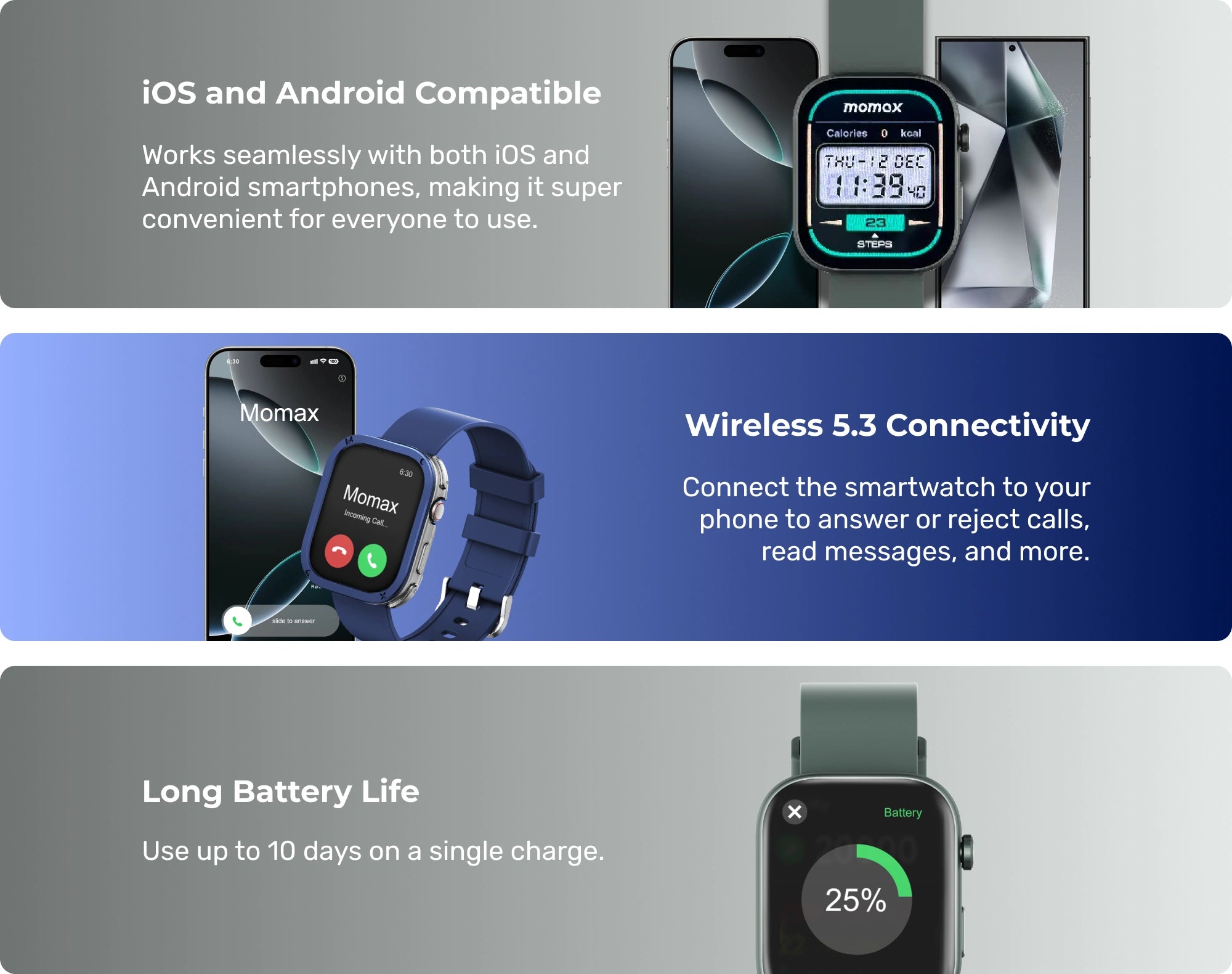 Get personalized health tracking and coaching with the Momax 1-Wear+ Pro Smart Watch. Monitor your heart rate, SpO2, and stress levels effortlessly. Enjoy advanced sleep analysis to improve your rest quality. With over 100 workout modes, accurately track your physical activities. Stay connected, handle calls, messages, and AI voice assistants directly from your wrist. Plus, it's water-resistant for daily use.
