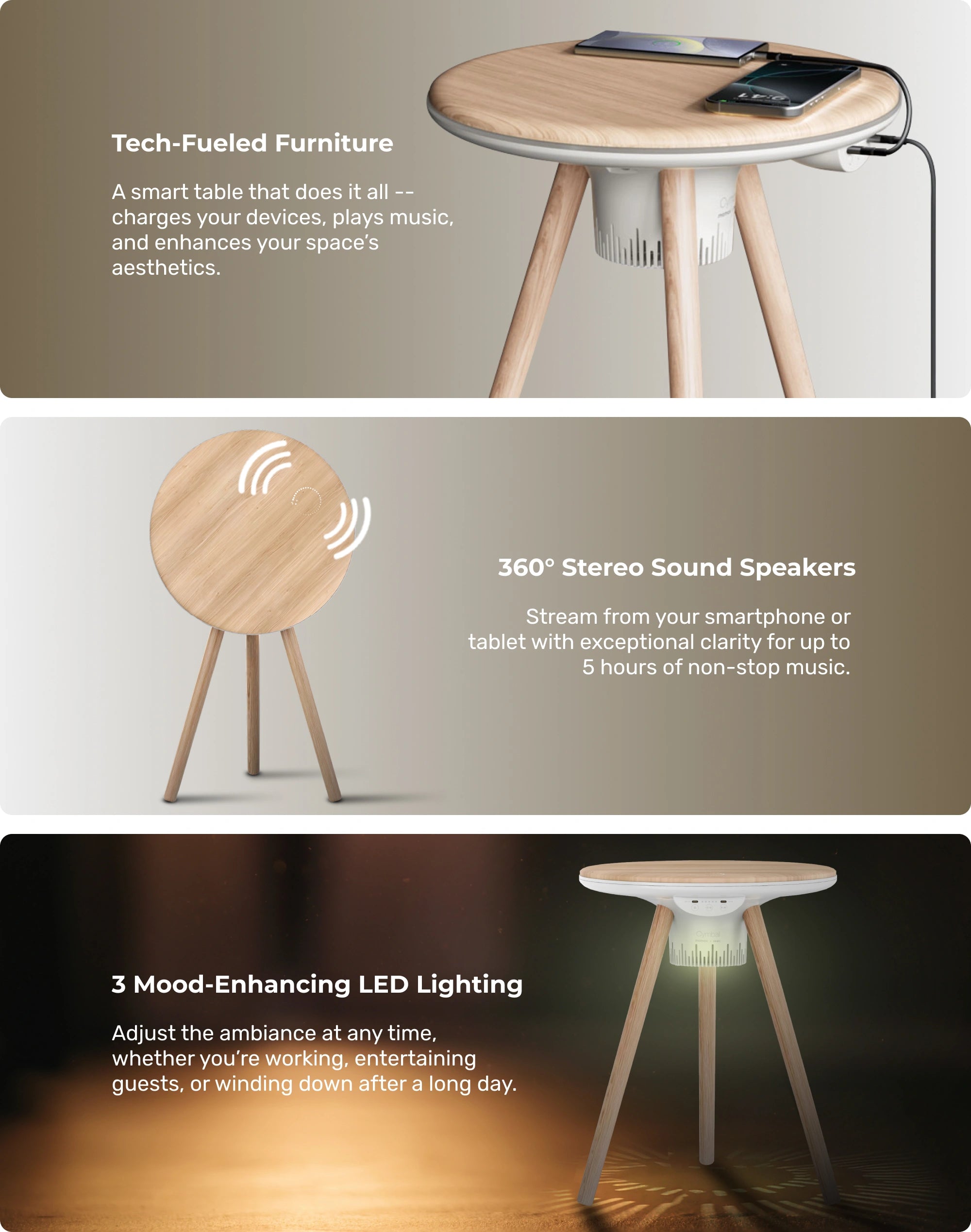 Cymbal Multifunctional Foldable Smart Table With Wireless Charging, Speakers, USB-C Ports, and LED Lighting Effects