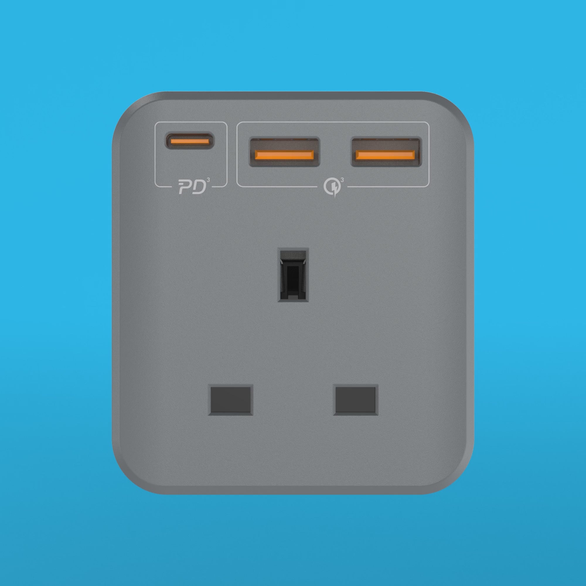 OnePlug 3 Oulet Extension Socket 20W is a 3-outlet power strip with 2 QC 3.0 USB-A ports and 1 PD3.0 USB-C port. It provides high speed charging performance and enable fast charging for your devices. The dual-rows design can help you save space at your home.