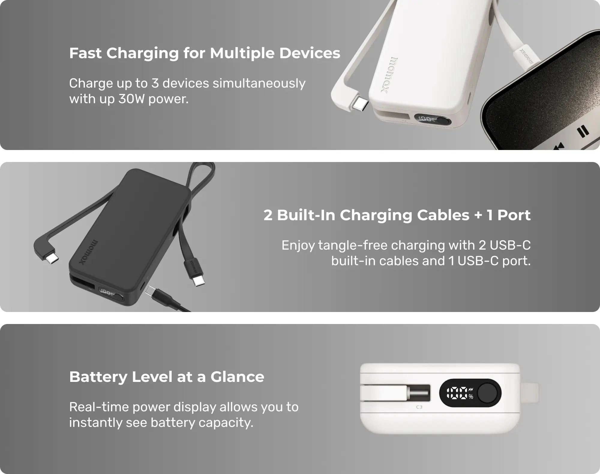 Comes with not just one, but 2 built-in USB-C cables! Enjoy this tangle-free design that eliminates the need for extra cables, reducing clutter and providing a seamless and reliable charging experience every time.