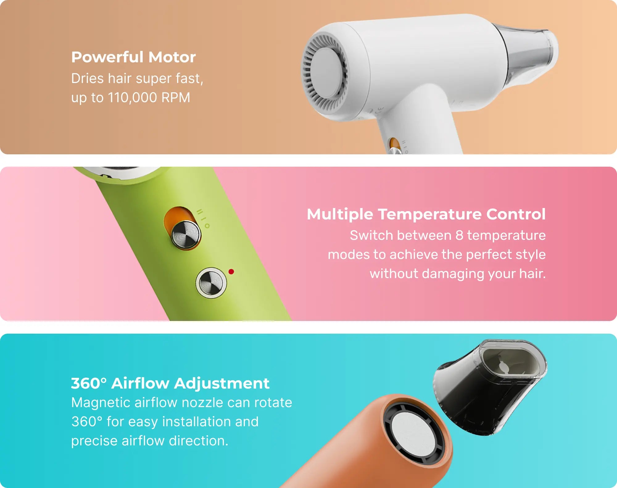 • Powerful motor that dries hair super fast, up to 110,000 RPM