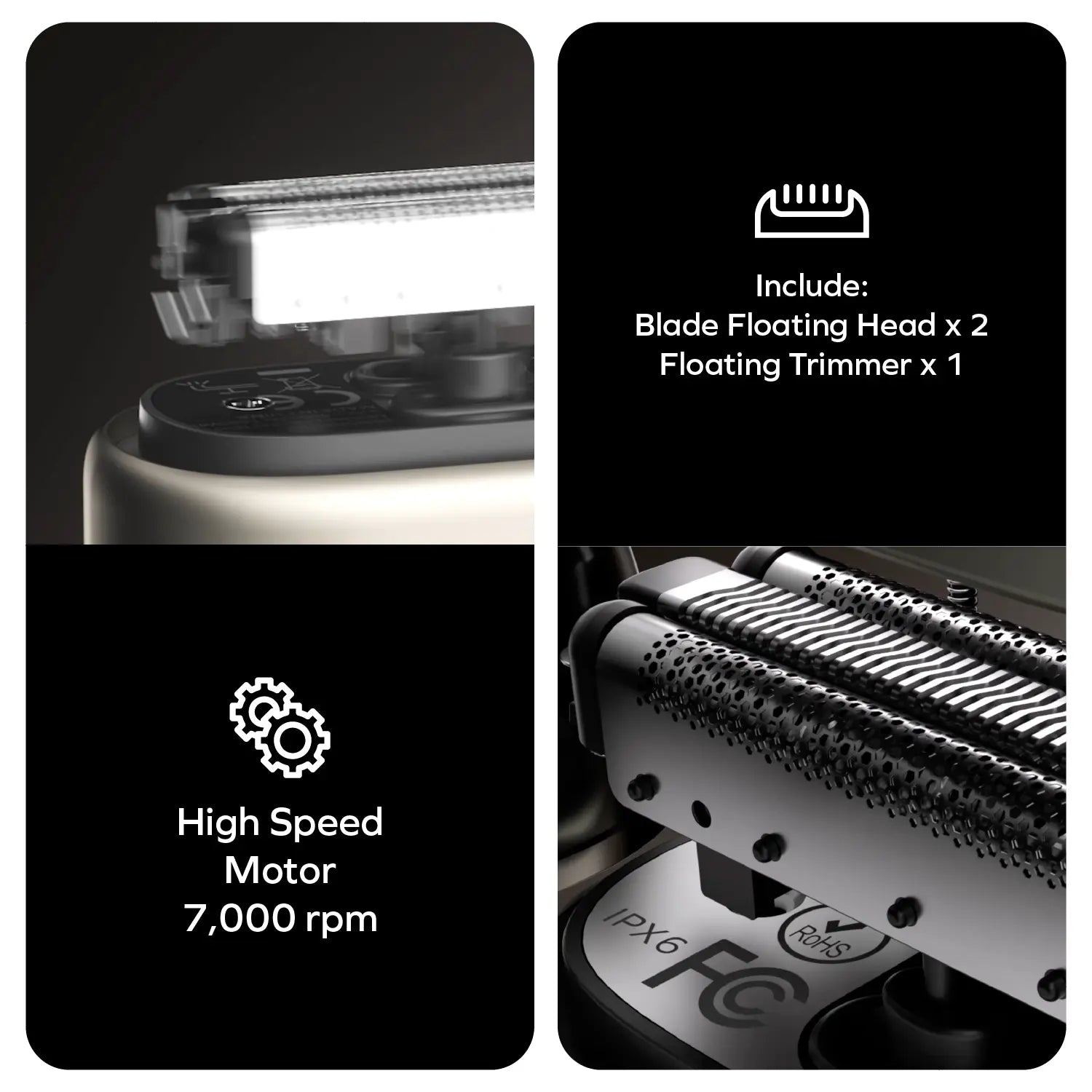 At the core of the Raze is a high-speed 7,000 RPM motor powering a dynamic triple-head system. Two flexible floating blade heads and one central floating trimmer move in perfect harmony, gliding across the contours of your face to capture every hair from any angle.