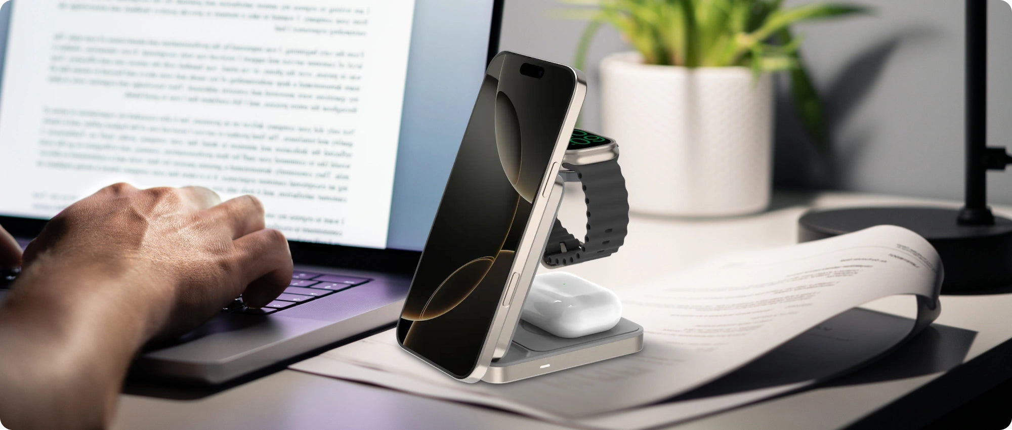 Featuring separate charging zones for your Qi-compatible phone, Apple Watch, and AirPods, this device lets you charge all your gadgets simultaneously, streamlining your charging routine and eliminating the hassle of managing various cables and charging docks.