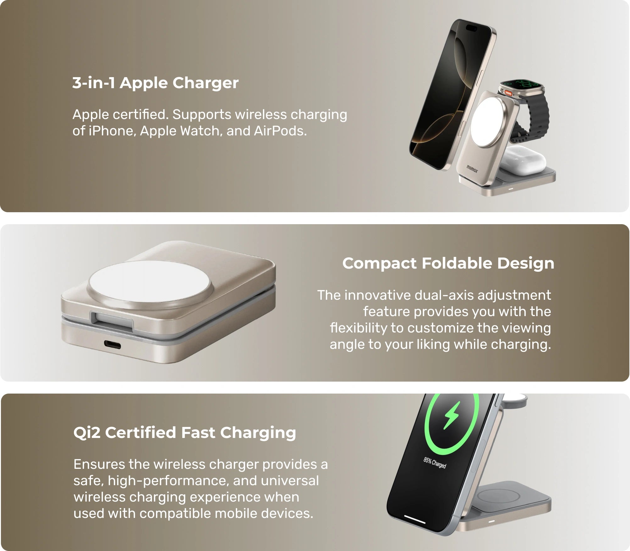 The Momax 1-Charge Q.Port offers efficient Apple Certified charging with up to 15W of power, eco-friendly design, adjustable viewing angles, and top-quality certifications, providing a stylish and practical 3-in-1 solution, perfect for any lifestyle.