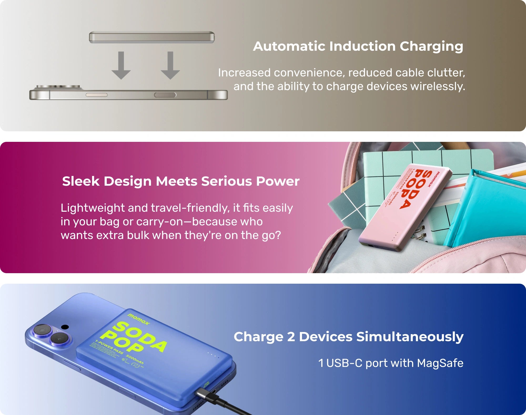 The 1-Power Pass power bank offers fast, reliable, and safe wireless charging for your iPhone and other devices, with a premium and durable design, Qi-compatibility, 2-way charging convenience, and travel-friendly portability, ensuring you can charge your devices quickly and confidently anytime, anywhere.