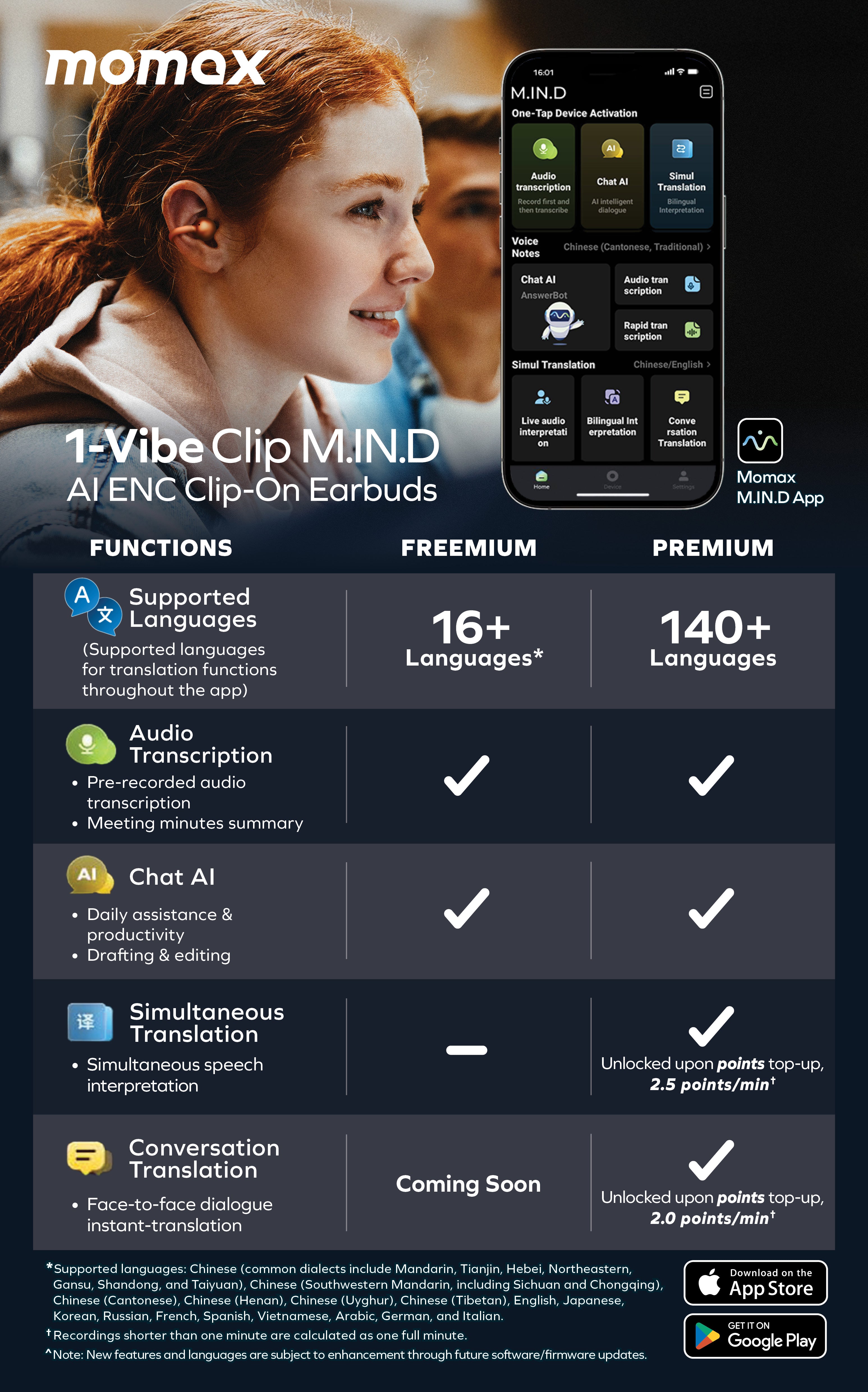 The innovative clip-on design delivers secure, lightweight comfort while the dedicated M.IN.D app unlocks intelligent features perfect for calls, music, and real-time translation across any scenario.
