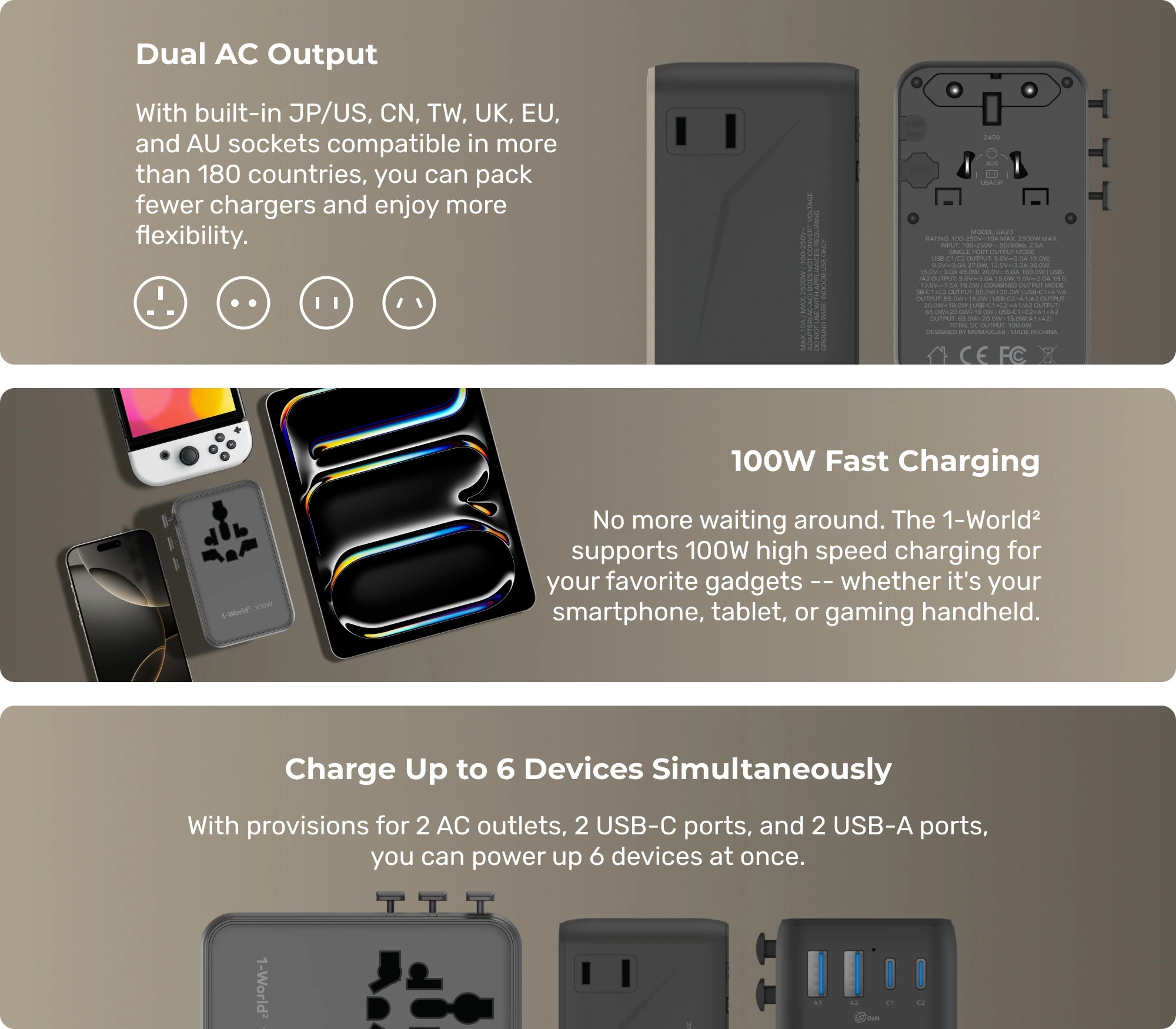 1-World² Universal 4-Port Travel GaN Charger 100W with Dual AC