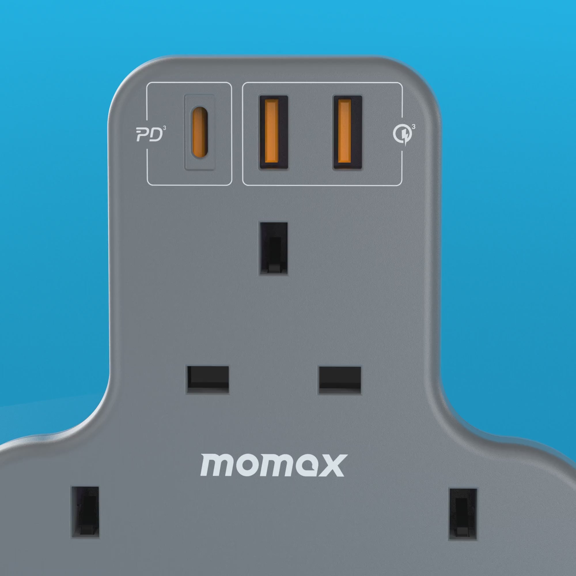 Momax T-Shaped Extension is a 3-outlet power strip with 2 QC3.0 USB-A ports and 1 PD3.0 USB-C port. It provides high speed charging performance and enable fast charging for your devices. The dual-rows design can help you save space at your home. It can offer stable and fast power output for up to 11 devices at the same time.