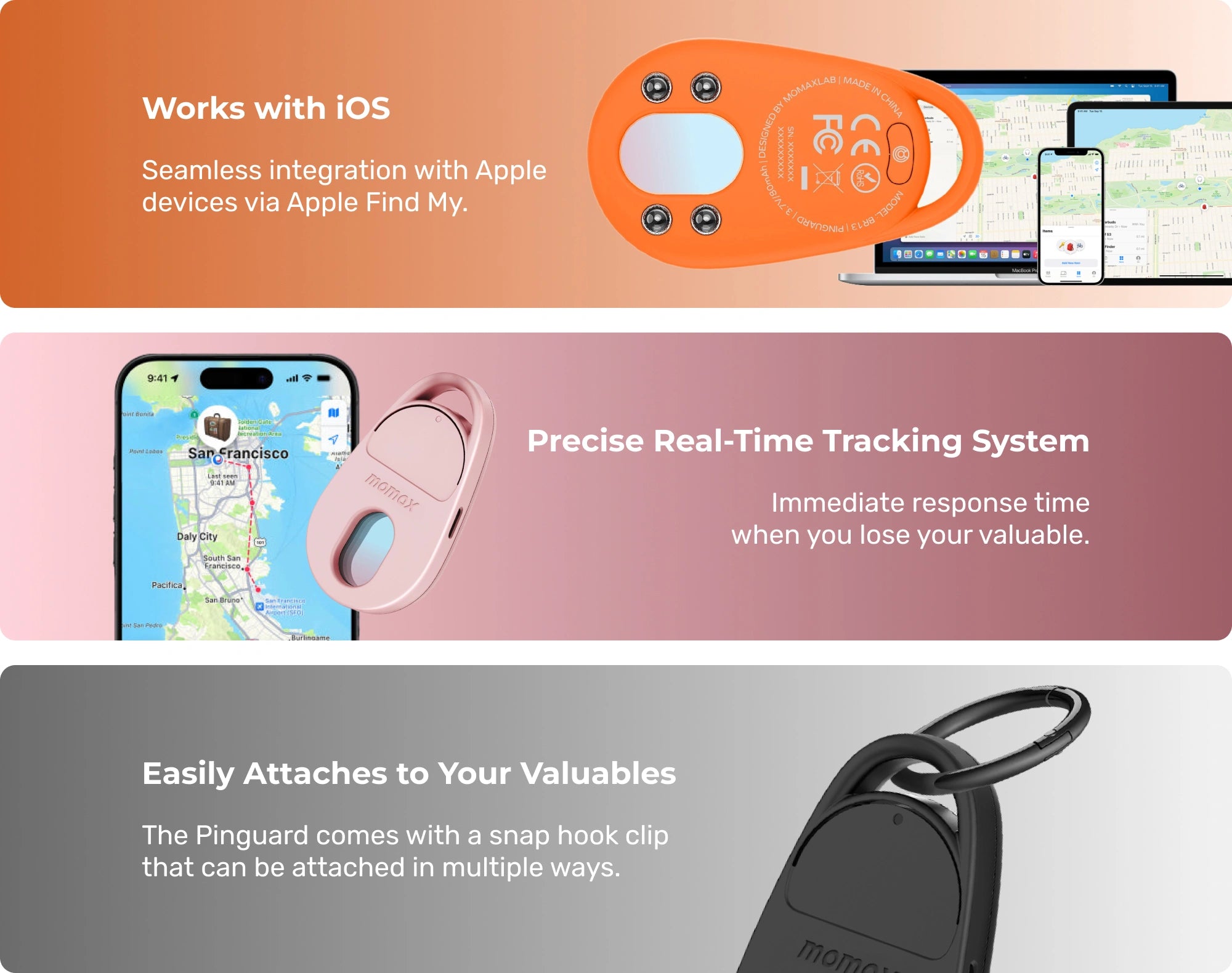 Step into a world where technology does the tracking for you! Whether you're all about Apple or part of the Momax crew, the Pinguard Find My Locator Tracker easily links up, helping you find your valuables hassle-free. You can download the Apple Find My app in the Apple App Store.