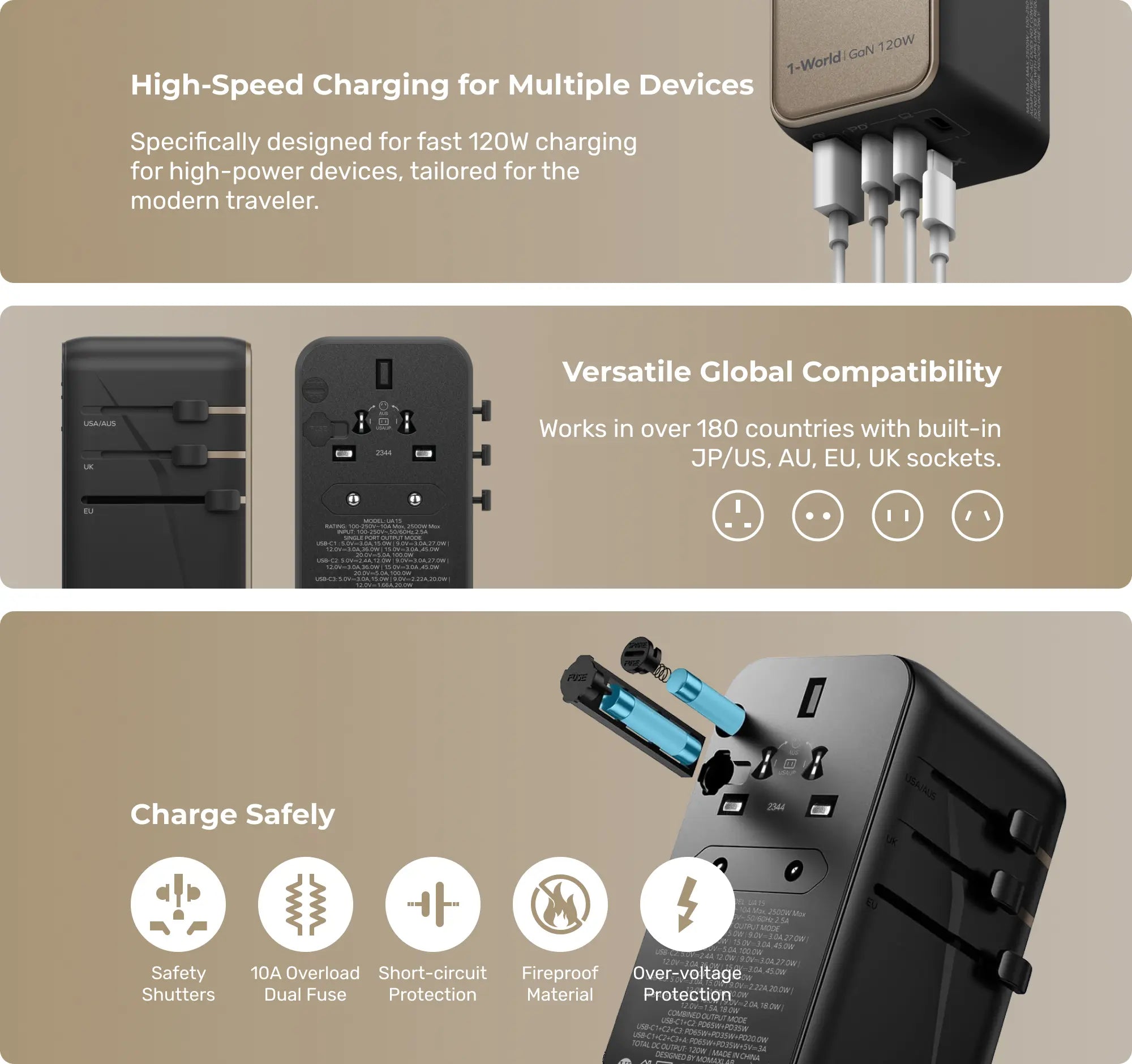 Safety is paramount with the 1-World Travel Charger. Featuring built-in fuse protection and crafted from high-quality, durable materials.